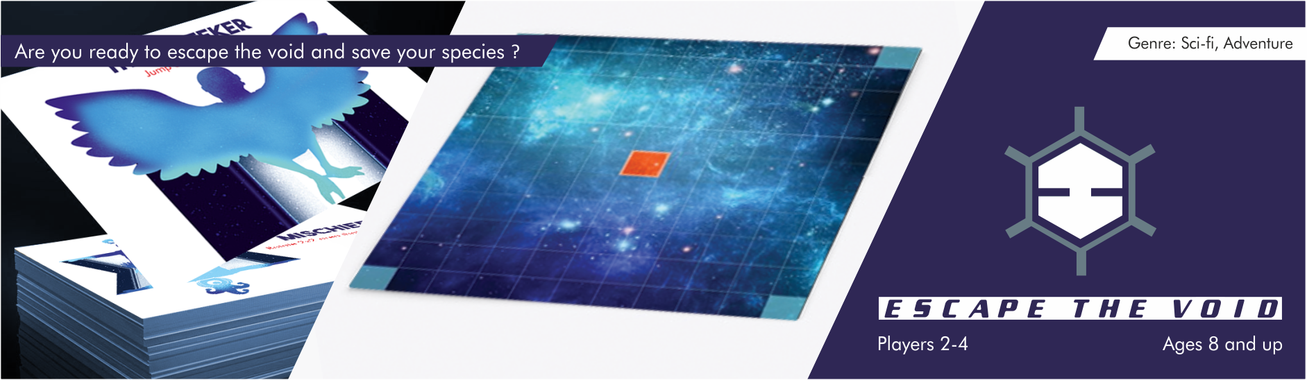 Escape the Void is a tile-based game is a space-themed symmetrical board game where each player takes turns progressing on the board, either trying to move closer to the centre or attempting to sabotage other players’ progress with event cards, modification dice and player abilities.
